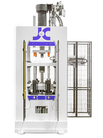 ■ Discesa rapida di avvicinamento traversa con velocità variabili: avvicinamento inizio ciclo; velocità pressatura; velocità risalita traversa rapido/lento; ■ Carrello per il caricamento materiale, fissato alla matrice mobile con piano di scorrimento in acciaio temperato antiusura e “scarpetta” di carico;